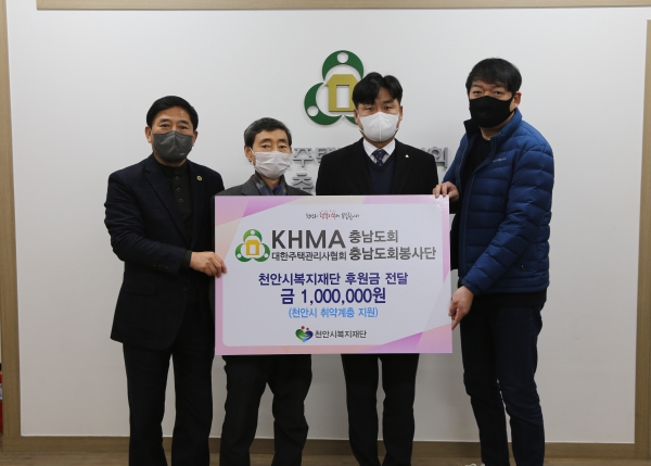 박상돈 천안시장은 “새해를 맞이해 소중한 나눔을 실천해 주신 배장환 대한주택관리사협회 충청남도회장님을 비롯한 회원분들께 진심으로 감사드린다”며 “기부해주신 후원금은 주거 취약계층 삶의 질 향상을 위해 사용될 수 있도록 하겠다”고 말했다.