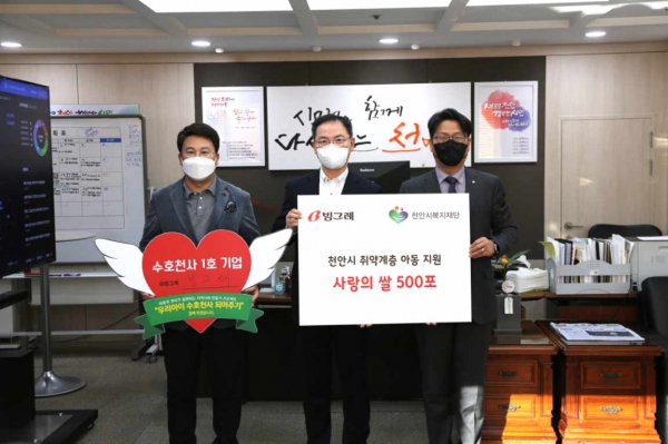 신동헌 부시장은 “작년에 이어 빙그레의 꾸준한 나눔 활동에 감사드린다”며 “아동의 행복이 우리의 미래인 만큼 아동의 권리가 보장되는 행복한 천안시가 될 수 있도록 더욱더 관심과 힘을 쏟겠다”고 말했다.