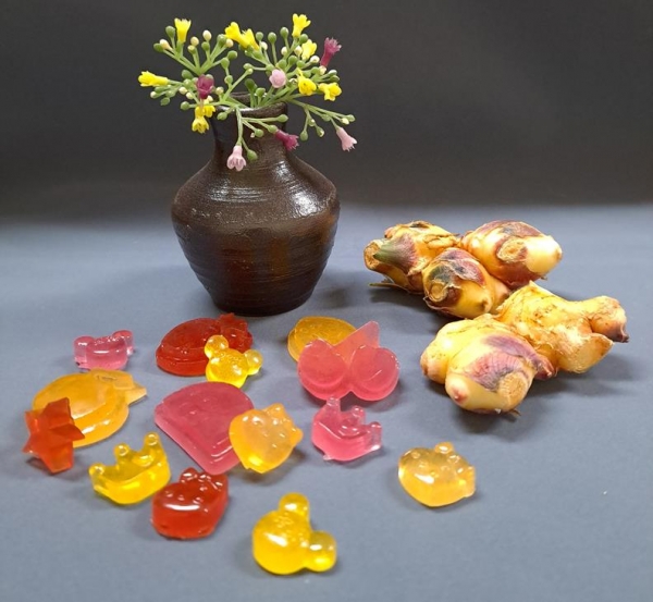 이에 도 농업기술원 농식품가공팀은 다양한 연령층이 부담 없이 생강의 향과 맛을 은은하게 느낄 수 있도록 착즙 후 남은 착즙박에서 추출한 생강액을 첨가한 생강 구미형 젤리 제품 2종을 개발했다.