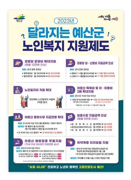 2023년 달라지는 노인복지 지원제도는 경로당 운영비 매월 10만원 인상 경로당 냉·난방비 지원금액 인상 월 100천원 ⇒ 월 115천원, 난방비 월 320천원 ⇒ 월 370천원) 어르신 목욕비 및 이·미용비 2배 확대지원 어르신 봉양수당 지급연령 확대 노인일자리 사업비 증액이 있으며 이 외에도 보훈수당 지원금액 인상 만70세 이상 대상포진 무료접종이 있다.