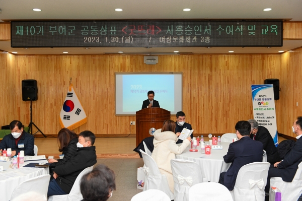 군은 지난 30일 여성문화회관에서 제10기 부여군 공동상표 ‘굿뜨래’ 사용승인서 수여식을 개최해 굿뜨래 상표를 승인받은 62개 조직에 사용승인서를 교부하고 교육을 실시했다.