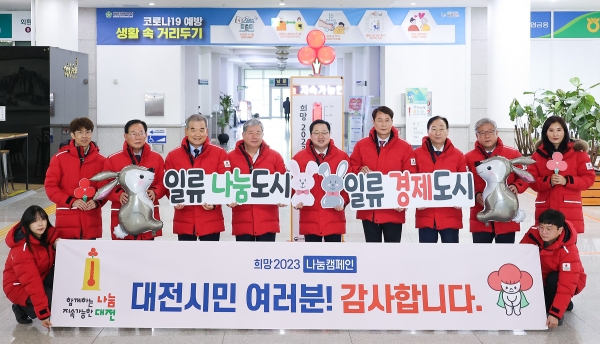 [Ytv영상스토리] 대전사회복지공동모금회는 1일 시청 1층에 설치된 온도탑 앞에서 이장우 대전시장, 이상래 대전시의회의장, 설동호 교육감, 정태희 대전사회복지공동모금회장 등 20여명 참석한 가운데 희망2023 나눔 캠페인 폐막식 행사를 개최했다.