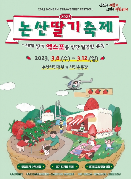 한편 2023년 논산딸기축제는 ‘세계 딸기 엑스포를 향한 달콤한 유혹’을 주제로 오는 3월 8일부터 12일까지 닷새간 논산시민공원과 시민운동장 일원에서 펼쳐진다.