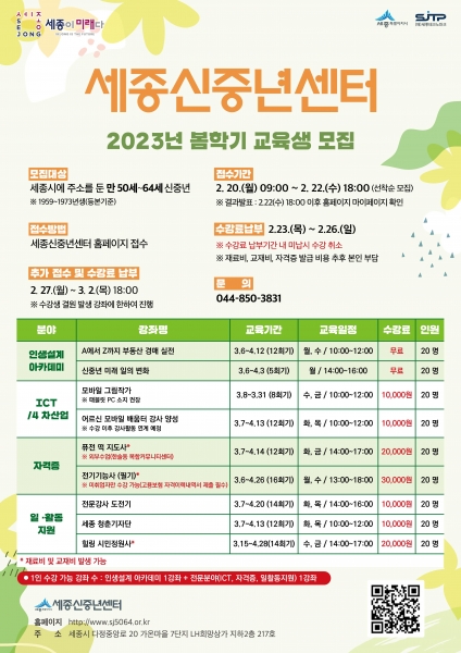 봄학기 교육생 모집은 오는 20일부터 22일 오후 6시까지 신중년센터누리집을 통해 선착순 접수한다.