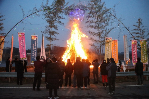 이어 제상을 차린 후 마을의 안녕과 한해 풍년 농사를 기원하는 재문 낭독에 이어 달집태우기로 축제는 정점에 오르며 시초면민 모두가 하나 되어 축제를 즐겼다.