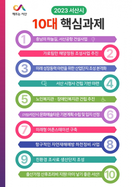 시에 따르면 10대 핵심과제는 충남의 하늘길, 서산공항 건설사업 가로림만 해양정원 조성사업 미래 성장동력 마련을 위한 산업단지 조성 본격화 서산 시청사 건립 기반 마련 노인복지관·장애인복지관 건립 추진 서산시 문화예술타운 기본계획 수립 및 입지 선정 미래형 어촌스테이션 구축 항구적인 자연재해예방 하천정비사업 친환경 조사료 생산단지 조성 출산가정 산후조리비 지원 아이 낳기 좋은 서산 추진 등이다.