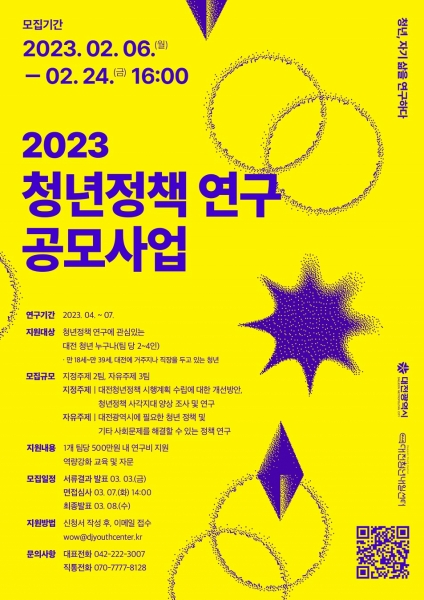 대전시 민동희 복지국장은 “청년 연구자가 대전 청년을 위해 실효성 있는 정책을 연구할 수 있도록 적극적으로 지원하겠다”며 “청년에게 꼭 필요한 정책을 함께 만들 수 있도록 청년정책에 관심 있는 많은 청년들의 지원을 기대한다”고 말했다.