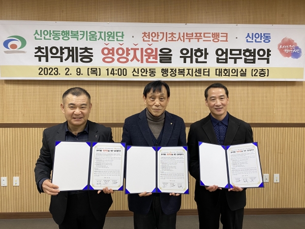 이번 협약에 따라 천안서부기초푸드뱅크는 신안동 복지사각지대 및 생계지원이 필요한 가구 등 10가구에 월 2회 기부식품을 제공할 예정이다.