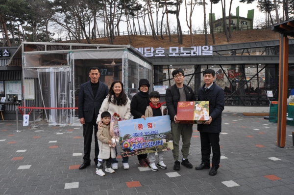 군은 10만 번째 탑승객에게 축하 꽃다발과 무료 탑승권 및 예산사과를 전달하고 방문을 환영하며 축하했다.
