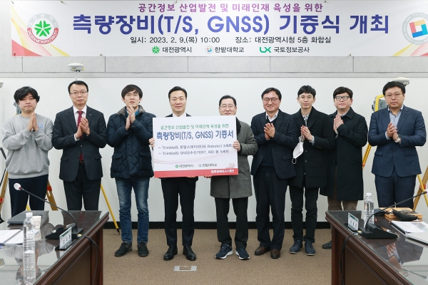이날 기증식에는 대전시 이택구 행정부시장, 한밭대학교 이승호 산학협력 부총장, LX 대전세종충남본부 정철원 본부장, 카이스트 장호종교수, 한밭대학교 양승호 교수, 도명식 교수, 김세헌 교수, 모빌테크 유형곤 본부장, 지오시스템 강무형 이사 등이 함께 했다.