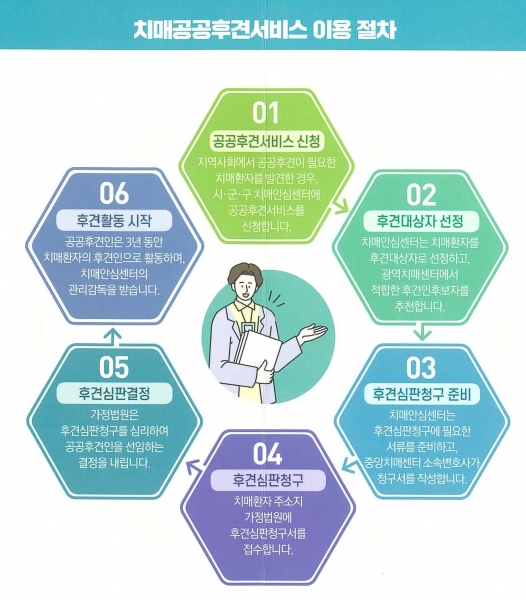 지원 절차는 치매대상자를 선정해 법원에 후견심판청구를 통해 후견인과 피후견인이 최종 결정되면 후견유형에 따라 치매환자의 통장 등 재산관리, 사회복지서비스 신청 및 의료서비스 이용 등 다양한 도움을 받게 된다.