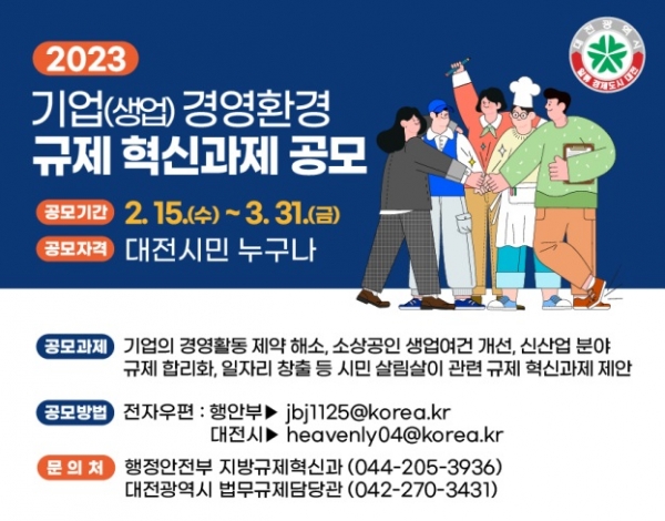 [Ytv영상스토리] 대전시는 행정안전부와 공동으로 오는 2월 15일부터 3월 31일까지 ‘2023년 기업 경영환경규제 혁신과제’를 공모한다고 밝혔다.