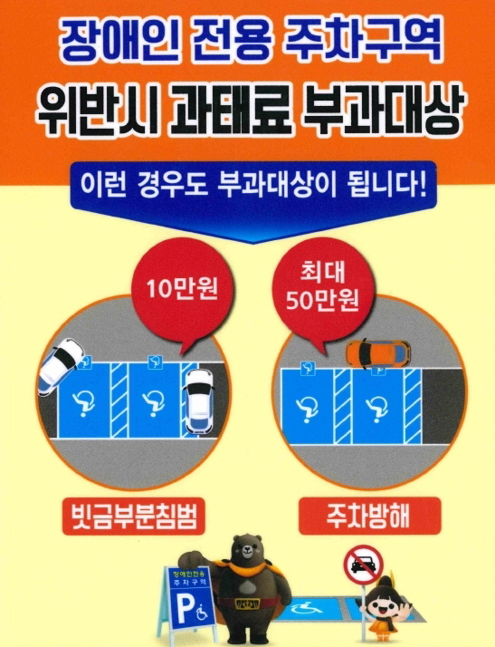 장애인전용주차구역을 위반하면 불법주차는 10만원, 주차방해 행위 50만원, 장애인사용자동차표지 위·변조 등 부당 사용 200만원 등의 과태료가 부과된다.