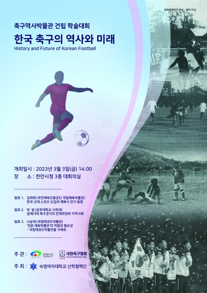 다음 달 3일 오후 2시 천안시청 대회의실에서 열리는 이번 ‘축구역사박물관 건립 학술대회’는 천안시가 추진하는 축구역사박물관 건립의 학술적 선행 연구 차원에서 마련됐다.