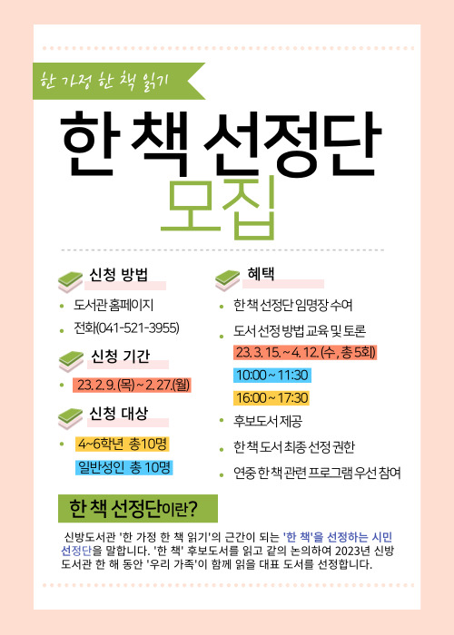 ‘한 책 선정단’은 일반 성인 10명, 아동 10명으로 3월 15일부터 매주 수요일 총 5회에 걸쳐 토론을 진행한다.