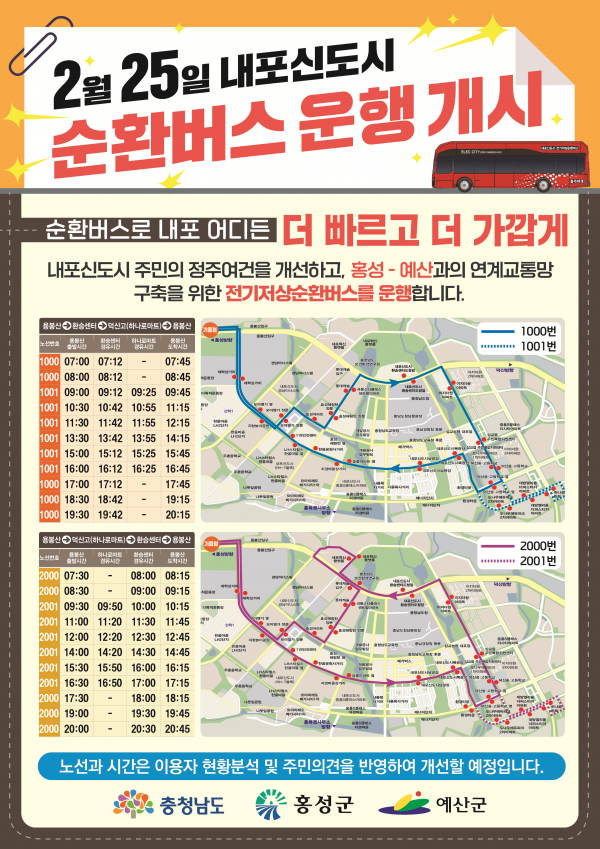 [Ytv영상스토리] 홍성군은 내포신도시 내 동일 생활권을 공유하고 있는 지역주민들에게 교통 편의를 제공하고 신도시 활성화를 도모하기 위해 오는 2월 25일부터 내포신도시 순환버스를 개통한다고 밝혔다.