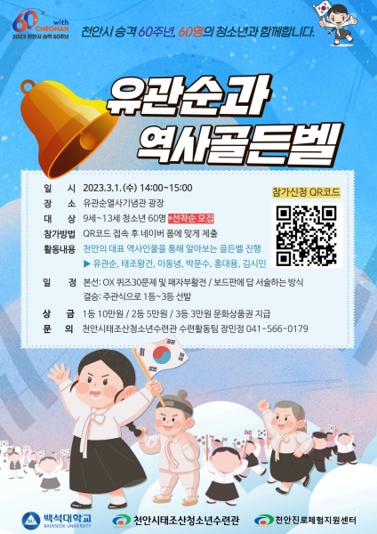 ‘유관순과 역사골든벨’은 청소년을 대상으로 우리 고장 천안의 대표 역사 인물인 유관순 열사를 비롯해 태조 왕건, 이동녕, 박문수, 홍대용, 김시민에 대한 올바른 역사의식 함양 및 애국심을 고취하기 위해 마련됐다.