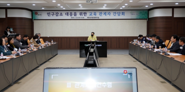 군은 지난 22일 군청 중회의실에서 가세로 군수 등 군 관계자를 비롯해 관내 19개 초등학교장, 태안교육지원청 장학사 등 20여명이 참석한 가운데 ‘인구 감소 대응을 위한 교육 관계자 간담회’를 개최했다고 밝혔다.