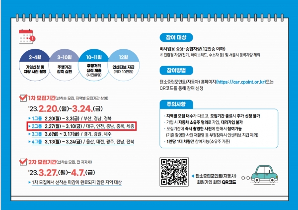 참여 희망자는 탄소중립포인트 홈페이지 또는 QR코드를 통해 회원가입 후 전송되는 URL을 통해 증빙자료, 누적 주행거리가 표시된 계기판 사진)을 제출하면 된다.