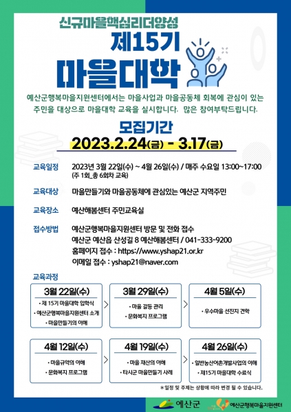 예산군행복마을지원센터, ‘제15기 마을대학’ 교육생 모집