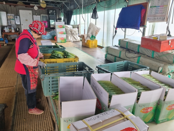 올해 첫 출하된 오이는 지난달 6일 첫 정식한 오이로 온풍기 등 난방시설을 활용한 가온 재배해 전년보다 1일 일찍 출하가 시작됐다.