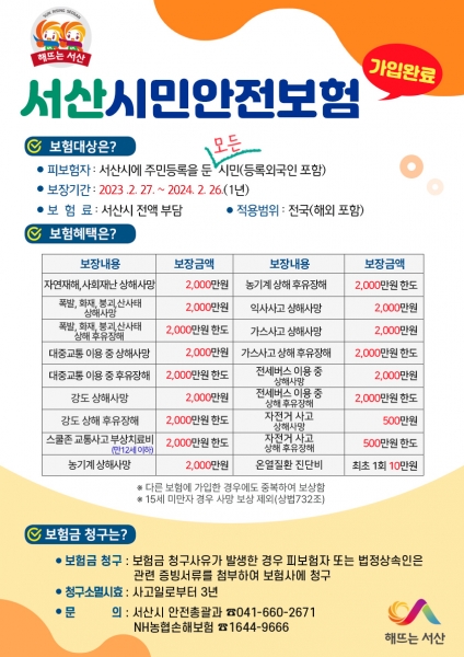 성기찬 서산시 안전총괄과장은 “올해는 사회재난과 일상생활 중 발생할 수 있는 보장항목을 2개 확대했다”며 “모든 시민이 알 수 있도록 홍보·안내하고 안전한 서산시 만들기에 최선을 다하겠다”고 말했다.