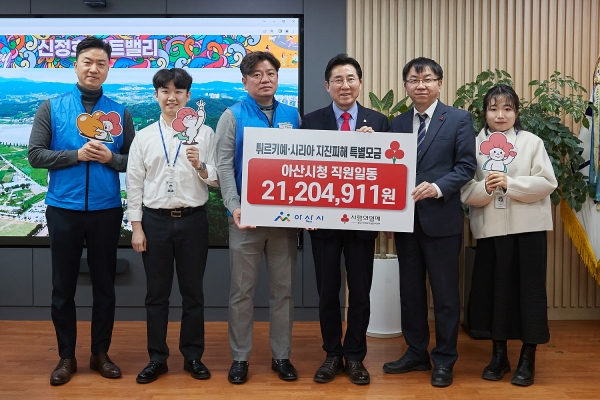 성금은 튀르키예·시리아 피해 지역 국민 구호에 동참하고자 지난 15일부터 17일까지 3일간 진행된 모금 운동에 아산시 공무원들의 십시일반 정성이 담겨 마련됐다.