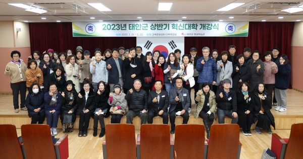 군은 오는 6월 30일까지 4개월 간 군 교육문화센터 다목적강당에서 실버인지놀이 지도사 등 21개 과정의 ‘2023년 상반기 태안군 혁신대학’을 운영키로 하고 지난 21일과 23일 두 차례에 걸쳐 개강식을 개최했다고 밝혔다.