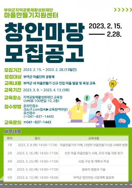 마을만들기지원센터 관계자는 “이번 창안마당을 통해 부여군 농촌마을이 역량 있는 공동체로 발돋움할 수 있도록 맞춤형 지원을 실시할 예정”이라고 말했다.