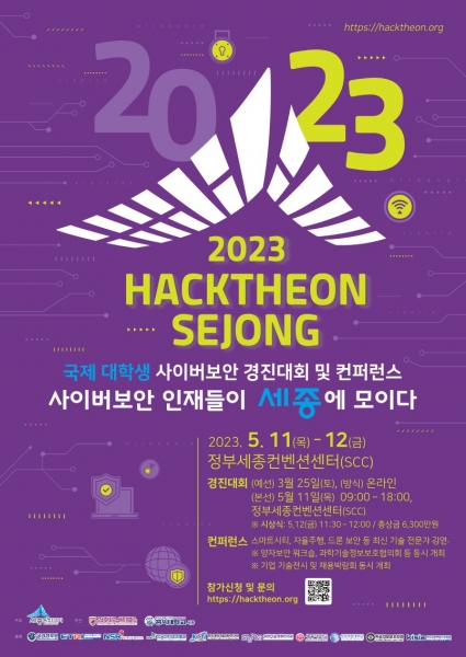 시는 오는 5월 11일부터 12일까지 정부세종컨벤션센터에서 ‘2023 핵테온 세종 국제 대학생 사이버보안 경진대회 및 컨퍼런스’를 개최한다.