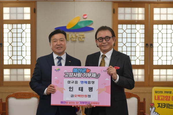 군 관계자는 “예산사랑에 앞장서는 명예읍장과 많은 기부자 여러분께 감사드린다”며 “기부금이 예산군을 더 살기 좋은 지역으로 만드는 일에 사용될 수 있도록 최선을 다하겠다”고 말했다.