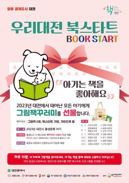 ‘2023 우리대전 북스타트’는 올해 대전에서 태어날 아기를 대상으로 대전시와 5개 자치구, 행정복지센터, 공공도서관, 출생신고 등록 의료기관 등 100여 개의 기관이 협력해 추진한다.