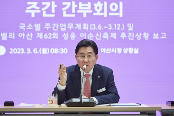 [Ytv영상스토리] 박경귀 아산시장이 지난 6일 시청에서 열린 3월 첫 번째 간부회의에서 “성웅 이순신 축제의 성공적인 개최를 위해서는 전 부서가 나서야 한다”며 부서 간 협업을 당부했다.
