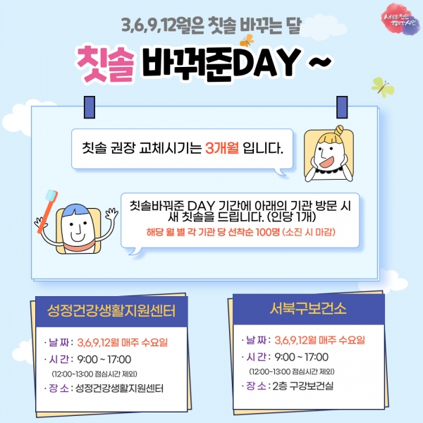 칫솔바꿔준DAY는 3·6·9·12월 매주 수요일 서북구보건소 구강보건실 또는 성정건강생활지원센터를 방문한 천안시민 선착순 100명에게 새 칫솔을 인당 1개씩 제공한다.
