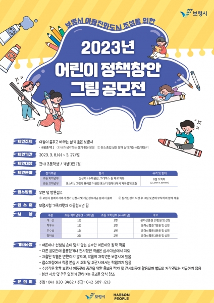 [Ytv영상스토리] 보령시는 아동의 정책 참여 증진과 아동친화도시 조성을 위해 ‘2023 어린이 정책창안 그림 공모전’을 개최한다고 밝혔다.