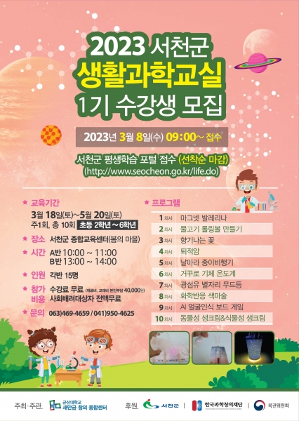 [Ytv영상스토리] 서천군이 18일부터 시작하는 2023년 1기 생활과학교실 참가자를 모집한다.