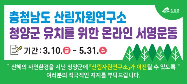 [Ytv영상스토리] 충청남도 산림자원연구소 유치에 집중하고 있는 청양군이 군민들의 관심도와 의지를 결집하기 위한 서명운동을 시작한다고 10일 밝혔다.