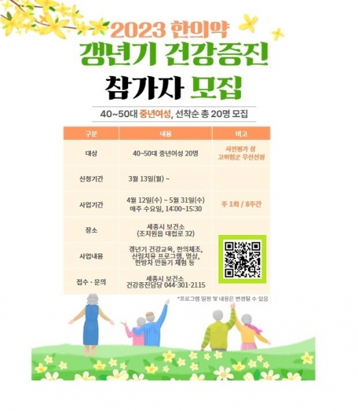 [Ytv영상스토리] 세종특별자치시보건소가 한의약 건강증진 사업 일환으로 다음달부터 갱년기 프로그램을 운영하는 가운데 13일부터 참여자를 모집한다.