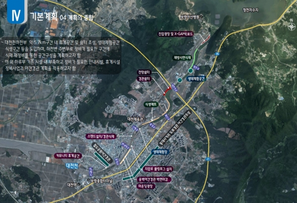 시는 이번 사업을 통해 대천천 상류 구간은 야간조명, 수변공원 등을 조성해 하천 경관을 향상할 예정이며 생태공간을 활용해 디딤돌 및 수생식물을 식재하고 생물서식처 반영 조류 쉼터 등을 조성해 쾌적한 친수공간을 형성할 계획이라고 전했다.