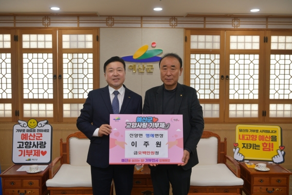 군은 지난 3월 7일과 16일에 이주원 신양면 명예면장과 원덕재 덕산면 명예면장이 예산군을 방문해 연간 개인 기부한도 최고액인 500만원을 각각 기탁했으며 민주평화통일자문회의 이명범 예산군 협의회장은 2023년 1분기 총회에 앞서 기부금을 기탁했다.