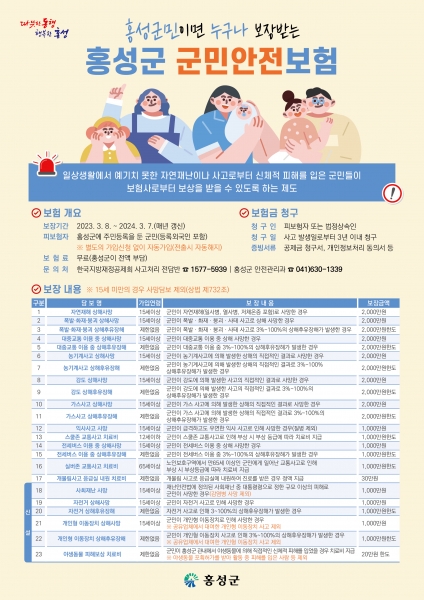 홍성군 군민안전보험은 관내 주민등록을 둔 군민이면 별도의 절차 없이 자동으로 가입되고 보험료는 무료로 군에서 전액 부담한다.
