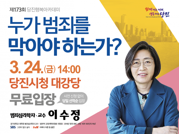 [Ytv영상스토리] 당진시가 24일 오후 2시 당진시청 대강당에서 범죄심리학자 이수정 교수를 초청해 제173회 행복 아카데미를 개최한다.