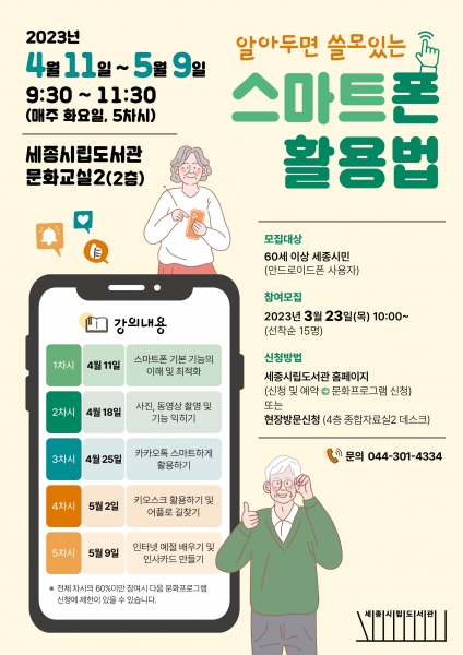 세종시립도서관이 60세 이상 세종시민을 대상으로 ‘2023 알아두면 쓸모있는 스마트폰 활용법’ 프로그램을 운영하는 가운데 오는 23일부터 신청을 받는다.