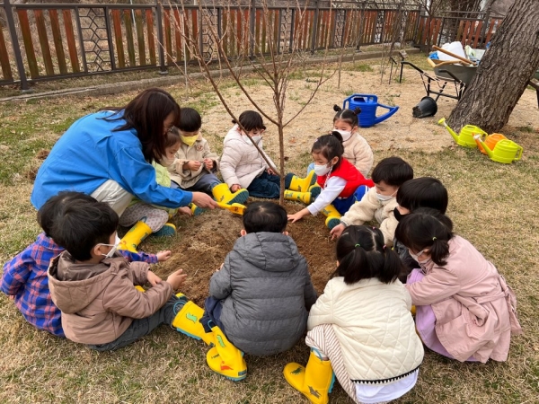 나무 모종을 본 유아들은 “선생님, 나무 키가 왜 이렇게 작아요?”라는 질문을 하면서 정성스럽게 흙을 담아 직접 심어보았으며 “나무야, 잘 자라라”이야기를 하며 자연과 직접 교감하는 시간을 가졌다.