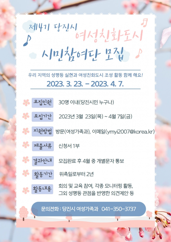 모집인원은 30명 이내로 선정 결과는 4월 중 개별 안내할 예정이며 접수 및 기타 궁금한 사항은 당진시청 여성가족과로 문의하면 안내받을 수 있다.