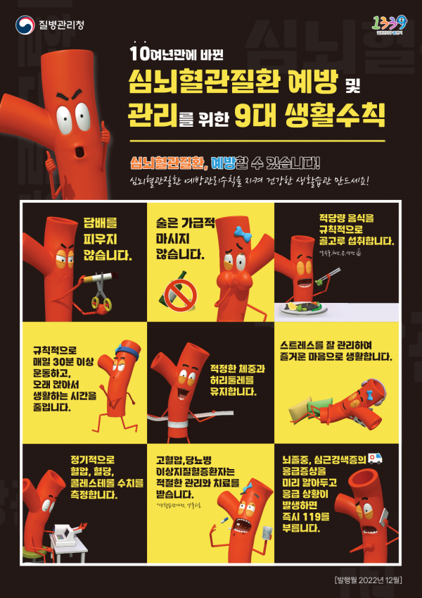 심뇌혈관질환 예방·관리를 위한 9대 생활수칙은 금연 금주 규칙적인 식사 매일 30분 이상 운동 적절한 체중 및 허리둘레 유지 스트레스 관리 정기적 혈압·혈당·콜레스트롤 측정 고혈압·당뇨병 이상지질혈증환자 관리, 치료 뇌졸증·심근경색증 증상 알고 발생 즉시 119 부르기 등이다.