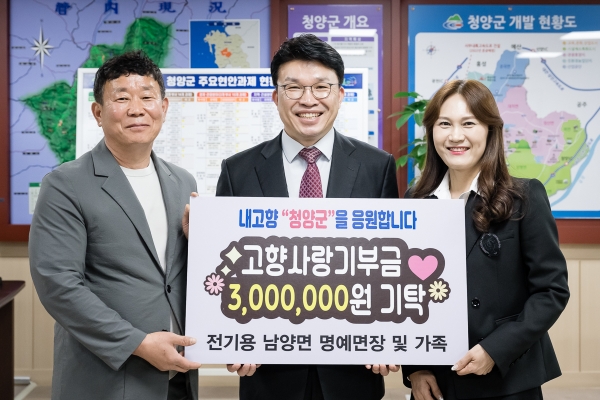 전기용 명예면장은 “내 고향 청양군을 응원하고 계속 청양군이 발전하기를 바라는 마음으로 기부금을 기탁하게 됐으며 청양사랑 기부가 계속 이어지길 바란다”고 전했다.