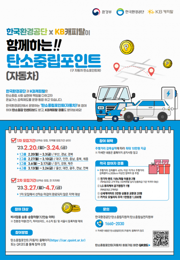 모집 대상은 세종시 등록된 비사업용 승용·승합차, 휘발유·경유·액화석유가스 차량 등이며 희망자는 마감일까지 탄소중립포인트 제도 누리집에서 신청하면 된다.