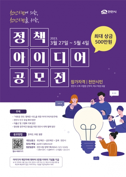 정책 아이디어는 국민신문고 이메일 우편, 팩스 등으로 제출 가능하며 자세한 사항은 천안시 누리집 행정공고·고시란을 참고하면 된다.