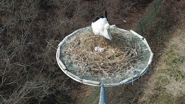 지난 2월 중순 황새 부부가 알을 품고 있는 모습이 처음으로 포착됐으며 3월 초 둥지 조사를 통해 모두 4개의 알이 확인됐다.